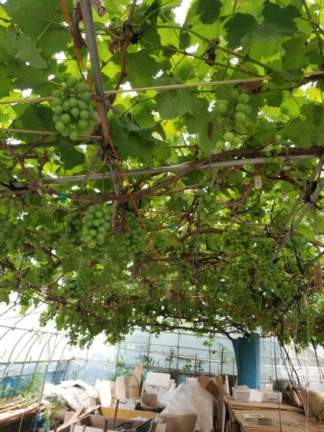 ?は、ブドウハウスの内部の画像である。まだ全体の数は数えていないが、一通りの摘粒作業が済み、後は色が乗ってくるのを待つばかりである。ミニハウ···