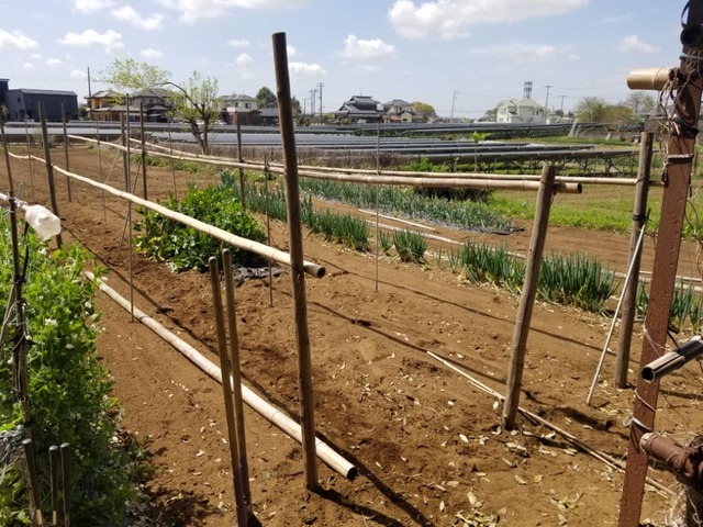 ?は、孟宗竹と足場丸太を利用して、露地栽培のアロイトマトとミニトマトの棚と垂直仕立てのサツマイモの棚を組み立てた。?は、西側から撮った画像であ···