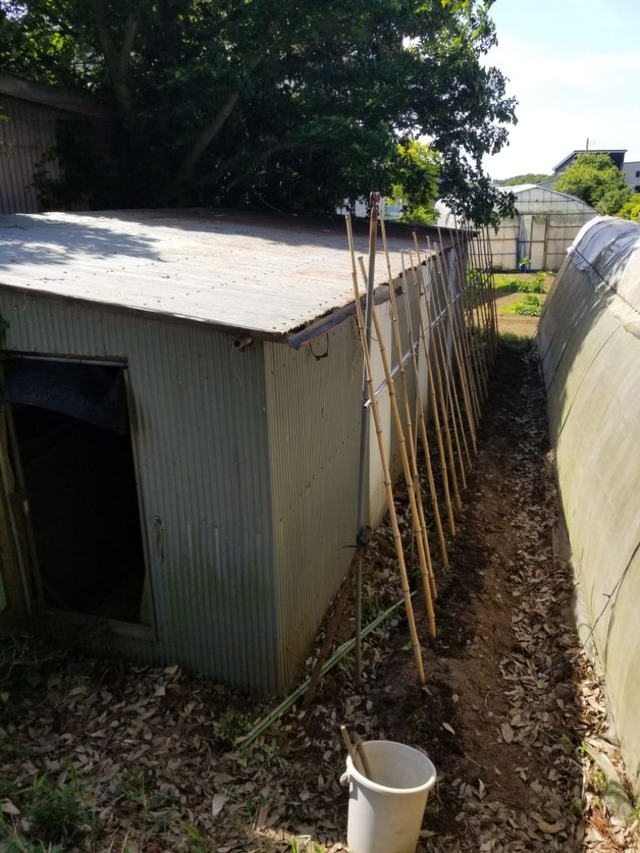 秋ナスの支柱立て 紅はるかの垂直仕立て 生姜、蒟蒻、里芋の追肥
