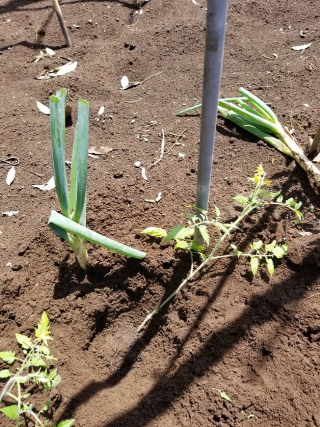 天気が良かったので、ミニトマトを植えることにした。?は、ネギとトマトの混植をすることにした。トマト苗は、斜め寝かせ植えを行う。トマトは無肥料···