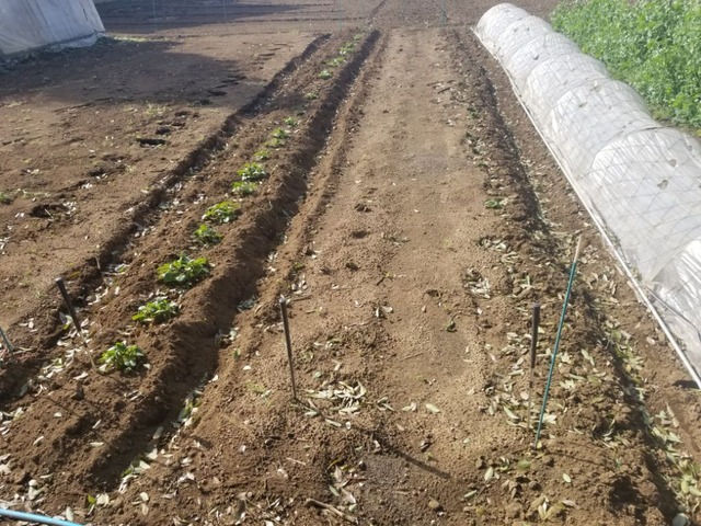 四季成りイチゴの植え替え ジャガイモ、ニンニクに草木灰施肥